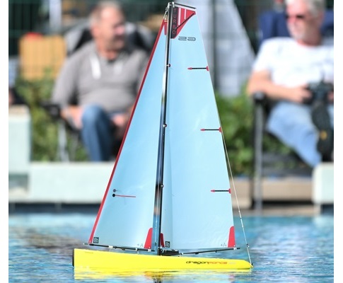 ![]() | Sunshine 65 auf Basis der Dragon Force 65 V7 Hersteller: Fertigmodell von Joysway Rumpflänge: 65 cm Rumpfbreite: 11,6 cm Masthöhe über Deck: 91,5 cm Gesamthöhe: 134 cm Gewicht: 1,2 kg (ohne Akku) Segelfläche: 22,3 dm2 (mit A-Rigg) Besonderheiten: Segelsatz A+ von Daniel Bergan aus Australien und gelb lackierter Rumpf Eigner: R. Fettig |
